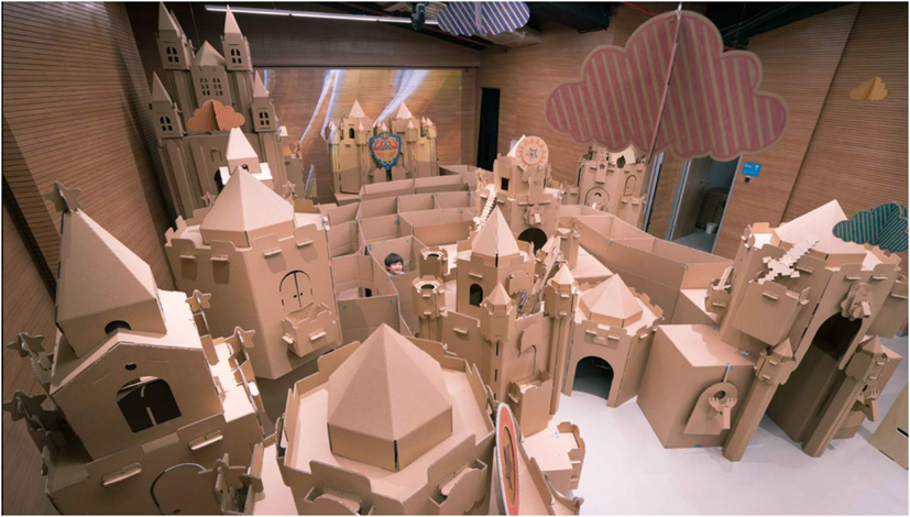 《紙箱城堡》,使用瓦楞紙搭建城堡及迷宮情境,尋常紙箱加上不尋常的創意,也可創作出令人驚喜的空間。體驗者可以童話般的情境中進行空間探索,同時體驗者也可利用紙箱、特制小工具和連接件完成立體結構搭建—房屋、盔甲、盾牌等。啟迪體驗者建筑結構、立體三維知識及廢物利用、愛護環境的環保意識。